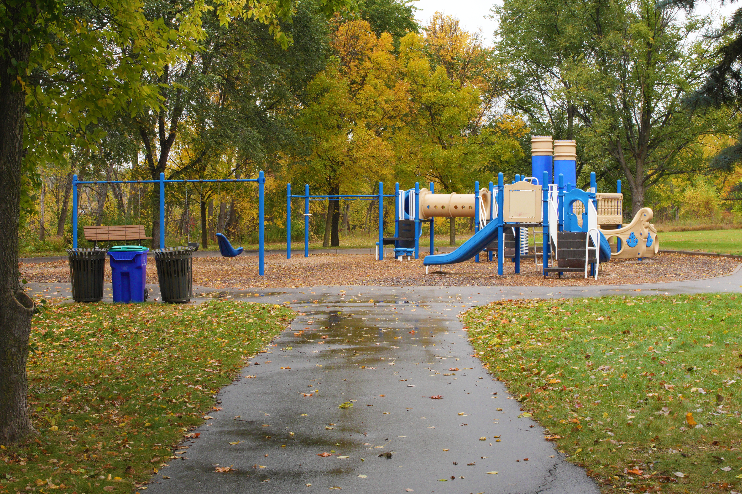 A paved trail covered in colorful fall leaves