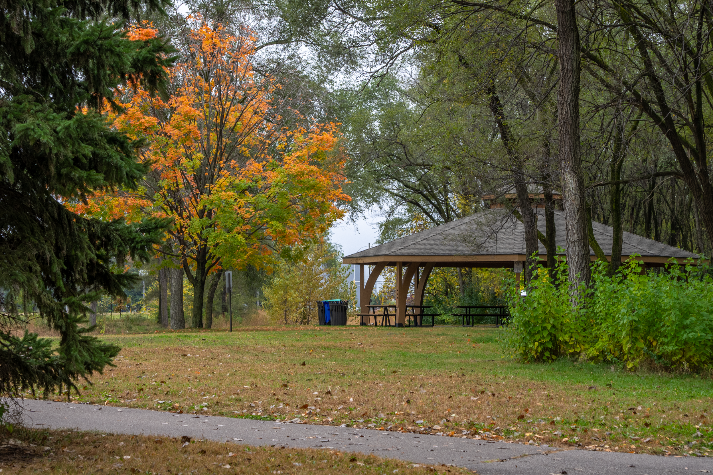 A park shelter next to a paved trail